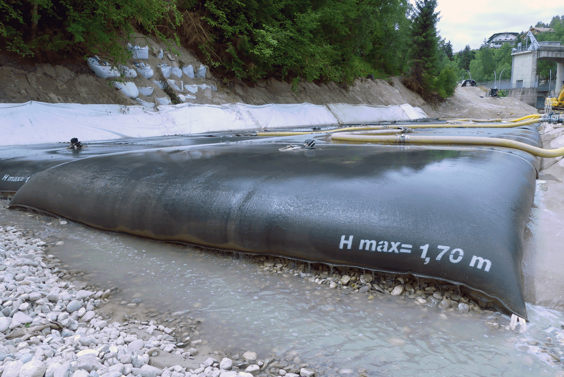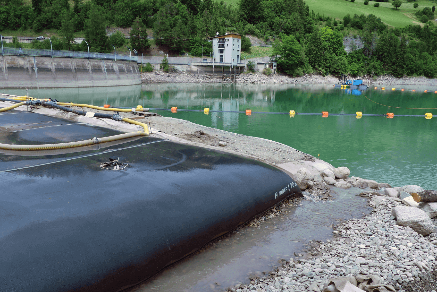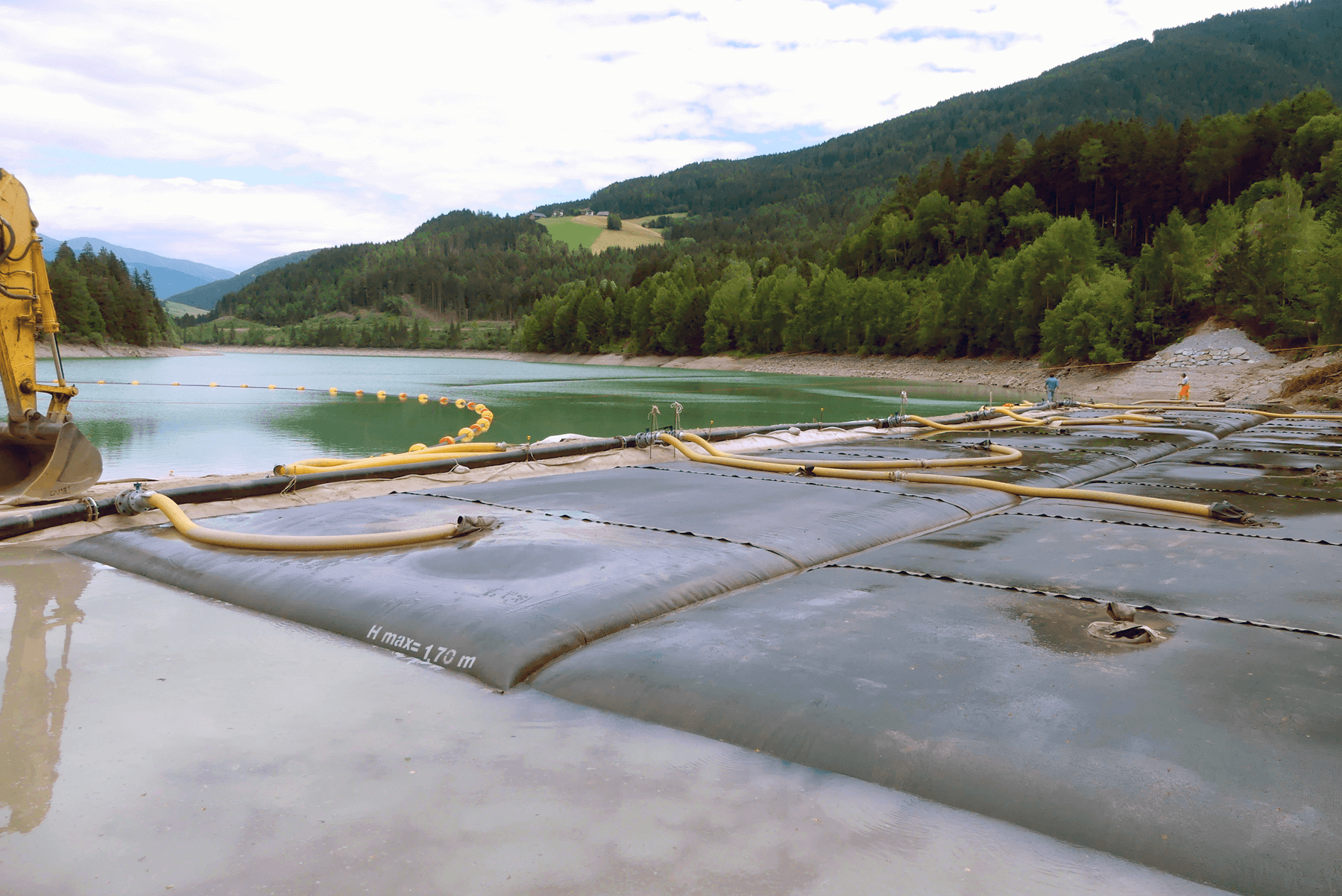 To ensure continuing reliability of the emergency discharge facility on the reservoir dam at Valdaora, near Bolzano, the operators arranged for the basin floor near the discharge works to be dredged. Some 2,500 m3 of accumulated material needed to be removed and suitably disposed of. It was decided that SINTEXTUBE D filters would be used to dewater the dredged deposits directly on site, following which the filled textile containers would remain in situ and be used as packing elements for reshaping the left bank of the reservoir, near to the dam. For reasons of space, and adaptation to the geometry of the slope, the SINTEXTUBE D filters were arranged on two levels, creating a stacked configuration that was studied by the Geosintex engineering department applying numerical analyses, so as to ensure the stability of the structure.