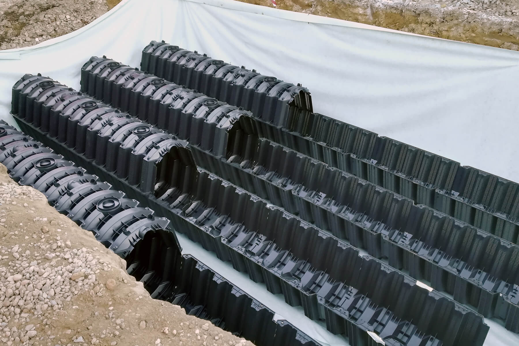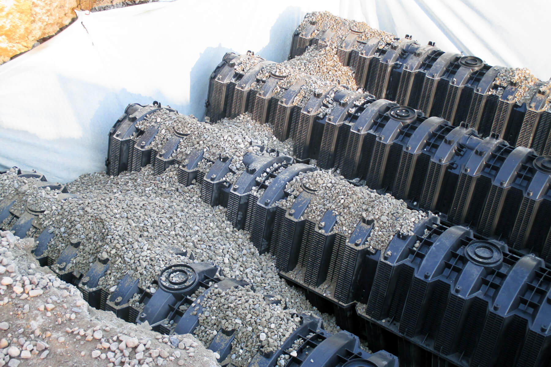 A new housing development in a hillside location had been provided with 3 dry wells of concrete construction serving to carry away rainwater. Checks revealed that the system was insufficient for purpose, and therefore needed to be improved by adding a solution necessarily of compact dimensions, given the limited space still available. Following an on-site inspection, Geosintex studied and sized a solution consisting of 4 ditches created using INFILTRATION TUNNEL elements in the Twin configuration (2 elements paired together so as to form a pipe with pierced walls affording a generous dispersal surface). The installation, completed in less than one working day, is guaranteed to carry away excess water rejected by the existing system of wells, should this become overwhelmed by a particularly heavy fall of rain.