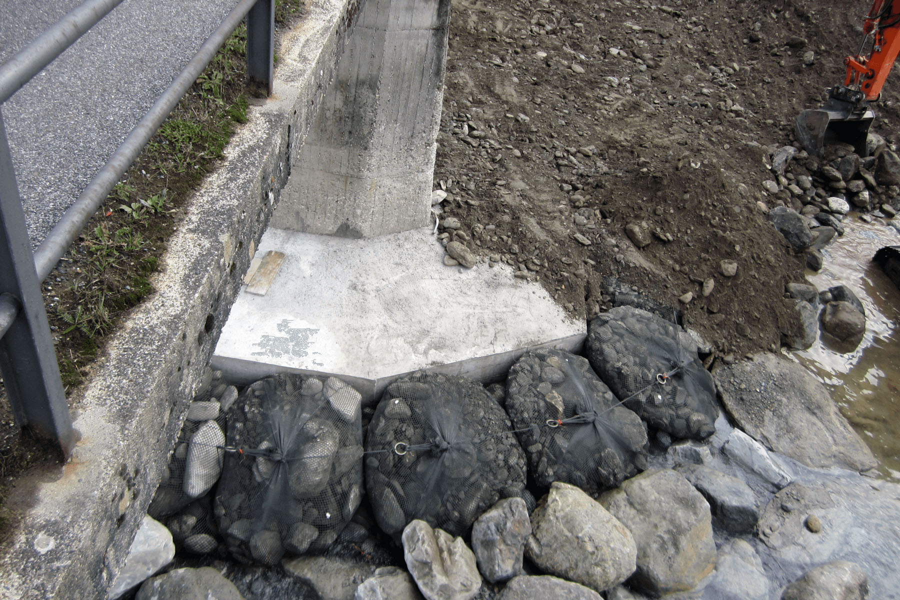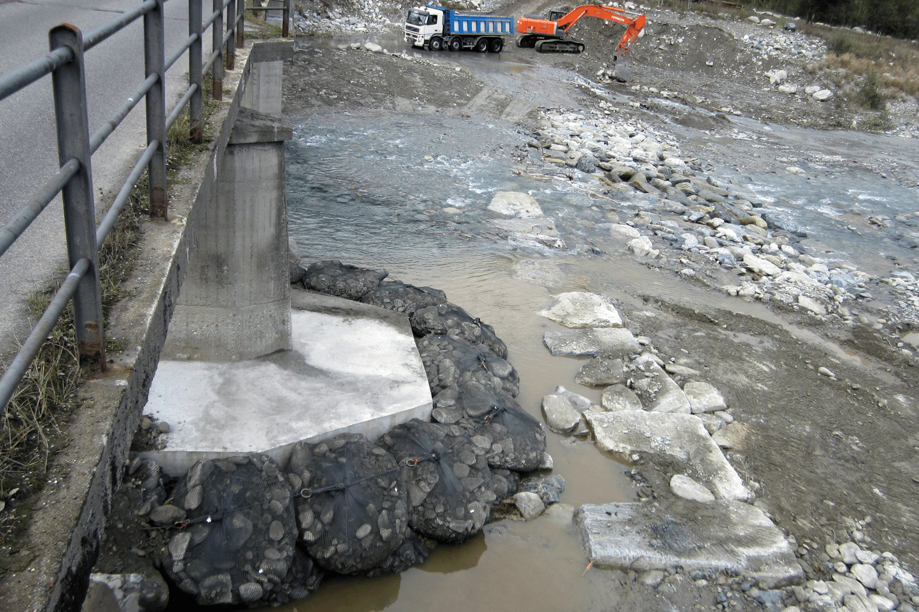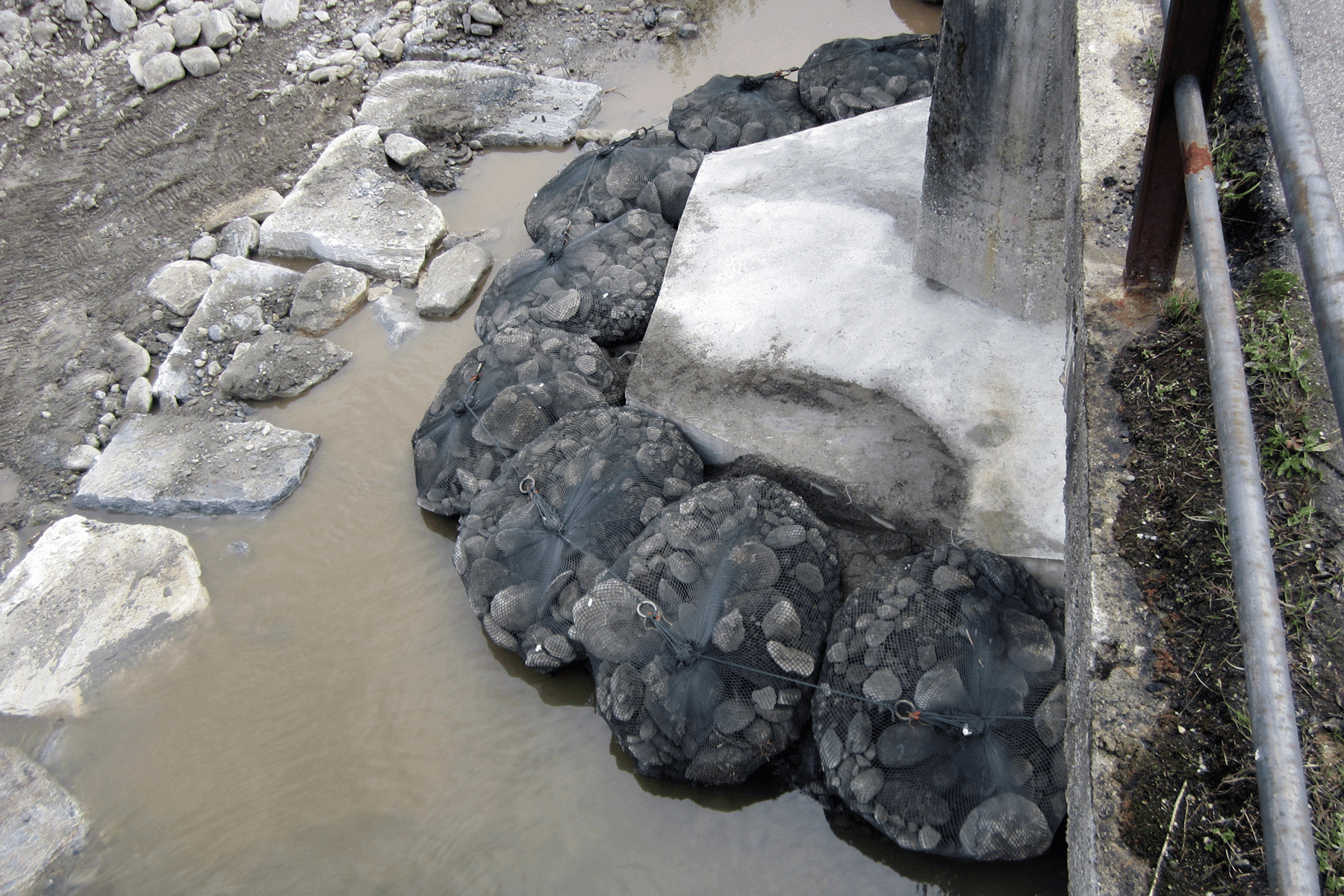 La pila N°5 del ponte delle Rovine che attraversa il torrente Pellice (affluente del Po) manifestava grossi problemi di erosione alla base, dovuta all’azione della corrente. Per evitare possibili danni all’infrastruttura è stato eseguito di un intervento di consolidamento della fondazione della pila mediante micropali e, successivamente, vi sono stati posizionati attorno 3 livelli sovrapposti di FILTER UNIT da 2 t, collegati tra loro e agganciati alla base con un cavo in acciaio. La soluzione si è rivelata molto semplice da mettere in opera e si inserisce molto bene nel contesto anche dal punto di vista estetico. Al fine di garantire la corretta esecuzione dell’opera, Geosintex ha prestato la propria assistenza nel corso della posa.