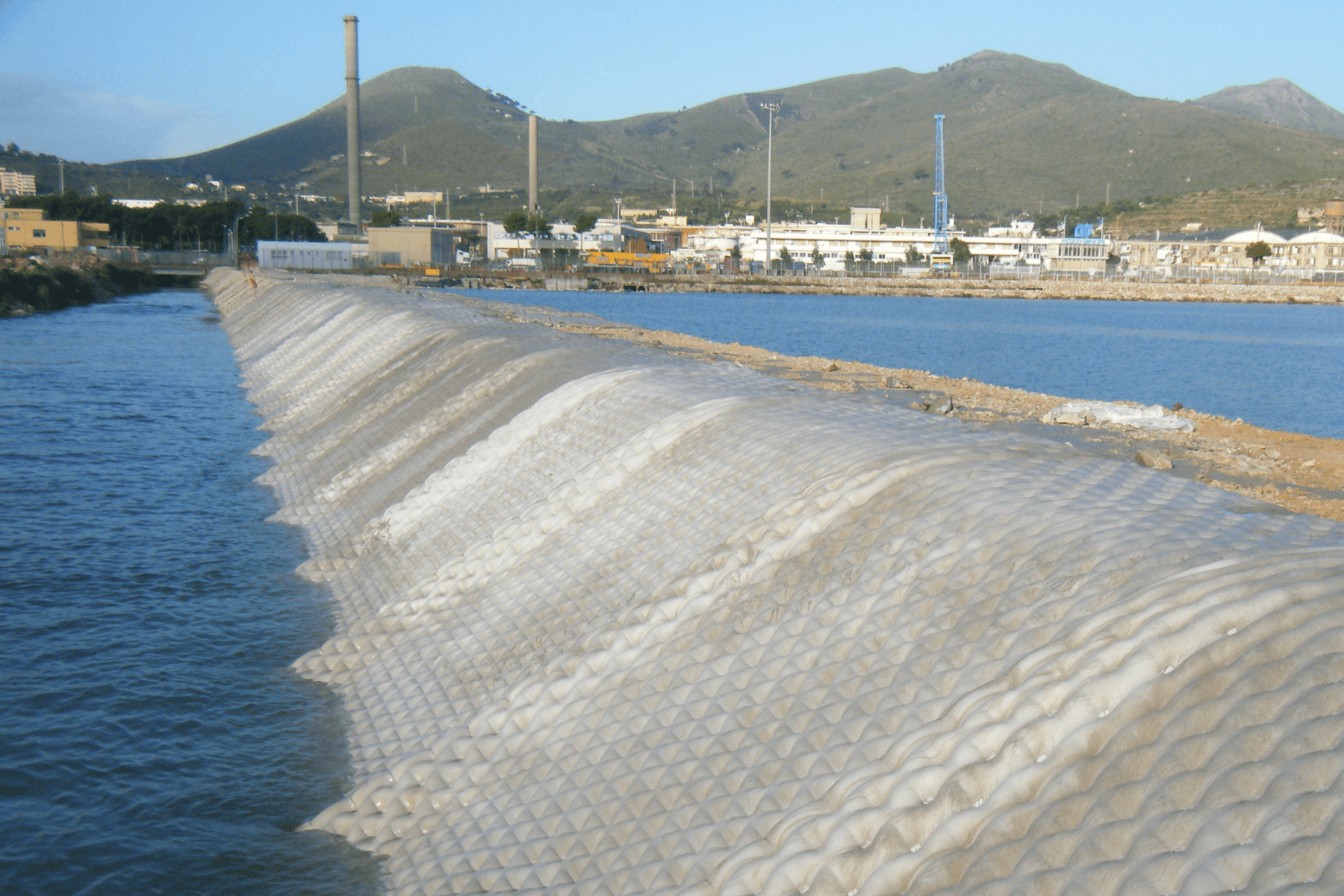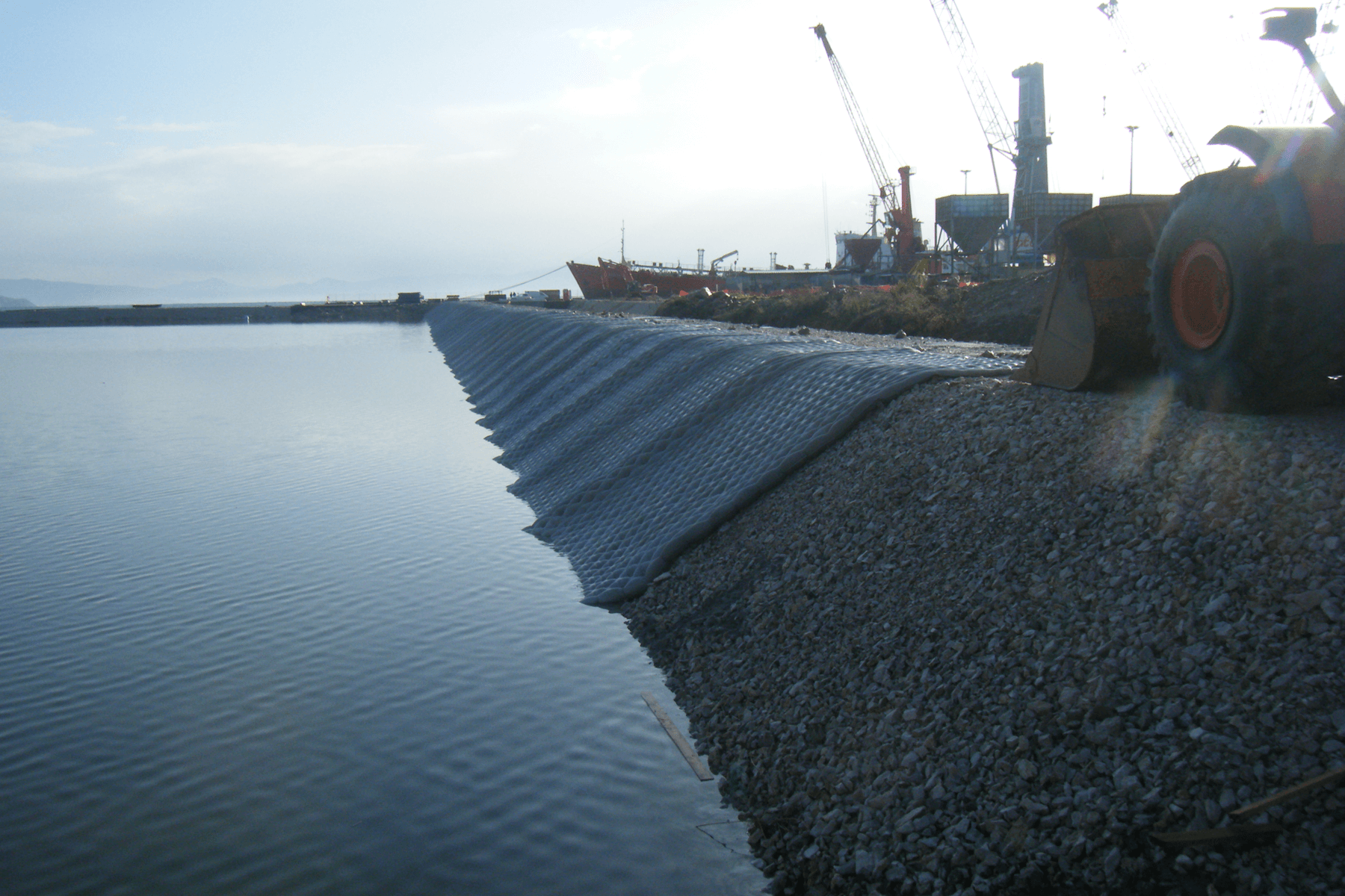 Nell’ambito dei lavori di ampliamento del porto di Gaeta è stata prevista la realizzazione di una cassa di colmata. Questo tipo di opera prevedeva non solo la protezione degli argini interni e di confinamento (realizzati con materiale proveniente da cava) dal moto ondoso e dalle correnti, ma anche la riduzione dei tempi di consolidamento del materiale di riempimento. Per la protezione degli argini, GEOSINTEX ha proposto l’utilizzo dei casseri tessili SINTEXMATTRESS, dotati di uno spessore pari a 13 cm e dei punti di filtrazione equispaziati, idonei per ridurre le sottospinte idrauliche provocate dal moto ondoso. L’ufficio tecnico ha eseguito delle opportune verifiche di stabilità dei materassi, sia nei confronti delle onde, sia in quelli della corrente longitudinale, al fine di garantire l’efficacia dell’intervento.